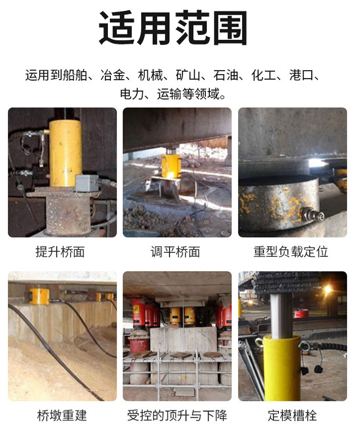 單作用中空千斤頂應用及其廣泛,適用于加工,維修牽引作業(yè)。在需要牽引的作業(yè)中,特殊的空心活塞設計使牽引桿或鋼索能夠穿過(guò)整個(gè)千斤頂進(jìn)行作業(yè),在各種壓合和機械牽引系統工作中,常用于向后牽引和向前擠壓的作業(yè)。當裝備有可互換的鋼制強化活塞底座時(shí),也能用于常規的舉升作業(yè)。二、使用方法